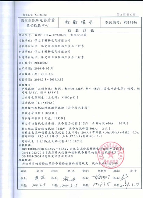 电缆分接箱检验报告2014 2018-07-11 09:38:53 未知 0次浏览 产品型号:DFW-12/630-20 签发日期:2014年03月15日 电缆 分 接箱 检验 报告 上一篇 箱型固定式交流金属封闭开关设备检验2012 下一篇 交流金属封闭环网开关设备检验报告2018 相关内容 碳足迹盘查报告-2023年 2024-05-13 16:44:55 碳足迹盘查报告-2021年 2024-05-13 16:43:25 碳足迹盘查报告 -2022年 2024-05-13 16:41:39 2023年社会责任报告 2024-05-13 16:40:24