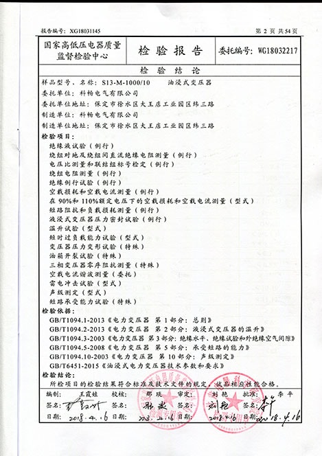 油浸式变压器检验报告2018 2018-07-11 10:04:10 未知 0次浏览 产品型号:S13-M-1000/10 签发日期:2018年04月16日 油浸 式 变压器 检验 报告 上一篇 油浸式变压器试验合格证书 下一篇 电力变压器型号备案证书2018 相关内容 华式变电站 2025-03-05 17:38:05 金属外壳系列箱式变电站 2025-03-05 17:36:41 非金属(GRC)材质外壳预装箱式变电站 2025-03-05 17:36:03 景观外壳预装式箱式变电站 2025-03-05 17:34:27